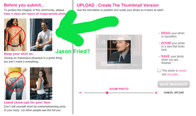 Match.com, on the other hand, is all blonde young professionals dressed in black. Their photos all have meat head guys cropped out of them, with just enough arm left in there to show you that they can get a guy like that.